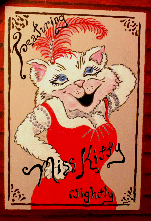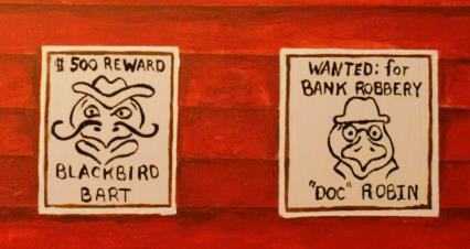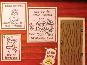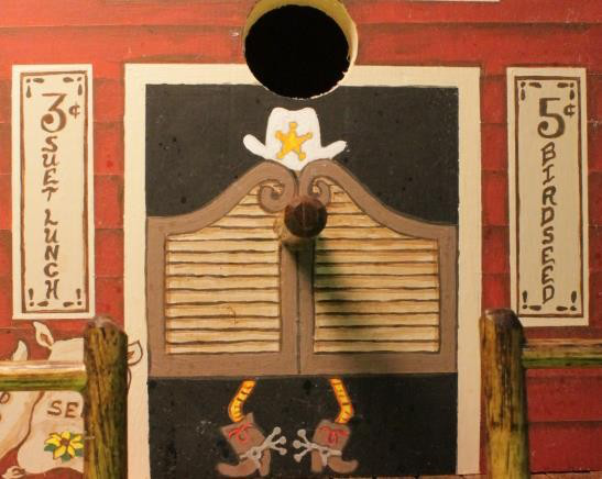 The house is surrounded with an oak boardwalk and fronted with a hitching post that serves double duty as a perch. Just inside the faux swinging door entry, we find the local sheriff. One must wonder if the sheriff entered the saloon to check with locals regarding the many wanted villains appearing on the posters attached to the saloon walls. It is also quite possible our sheriff stepped in for a few hands of cards in Sparrows Poker room. Or, perhaps it was simply that lunch time pricing for the bird seed or the suet lunch fit our sheriff’s budget. We think the most likely reason for the sheriff’s appearance was the opportunity to enjoy Miss Kitty’s nightly song and dance routine.